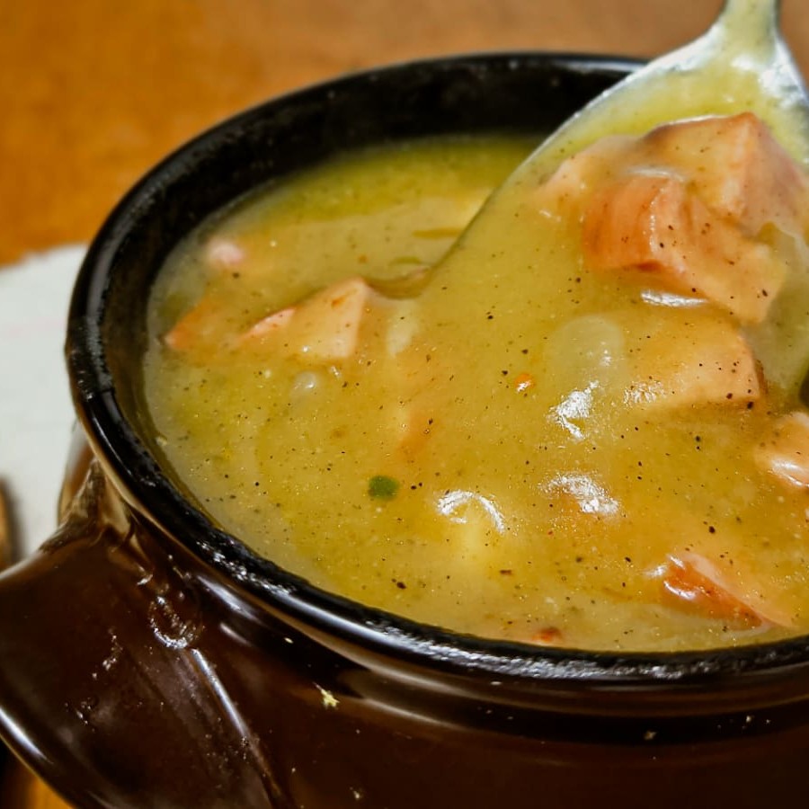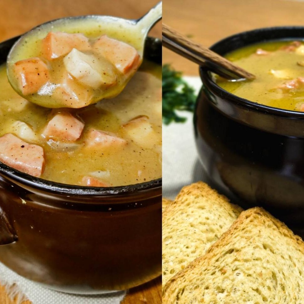 Um excelente caldo de mandioquinha com calabresa picada e cheiro verde.