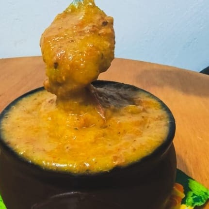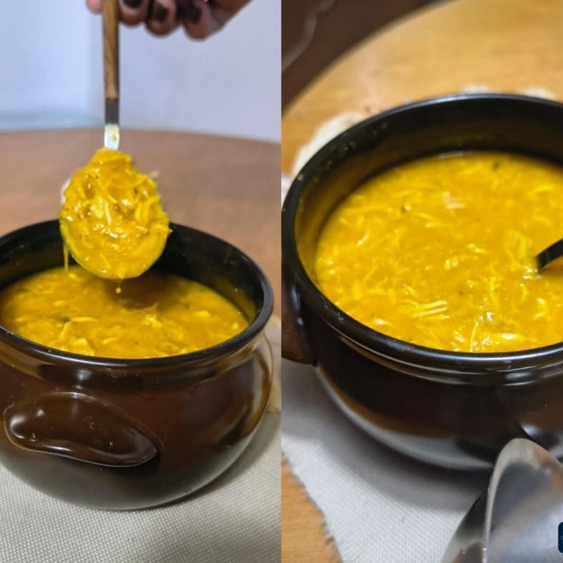 Um delicioso caldo de abóbora cabotiá com frango desfiado com tempero caseiro e cheiro verde