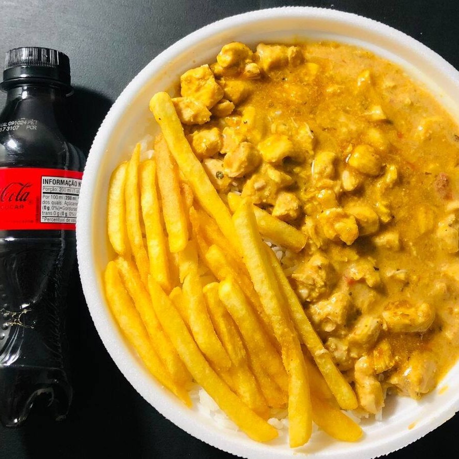 Marmita com delicioso filé de frango ao molho estrogonofe acompanhado de arroz branco e batatas fritas. Acompanha refrigerante pet Coca Cola bem gelado. Marmita indicada para 01 pessoa.