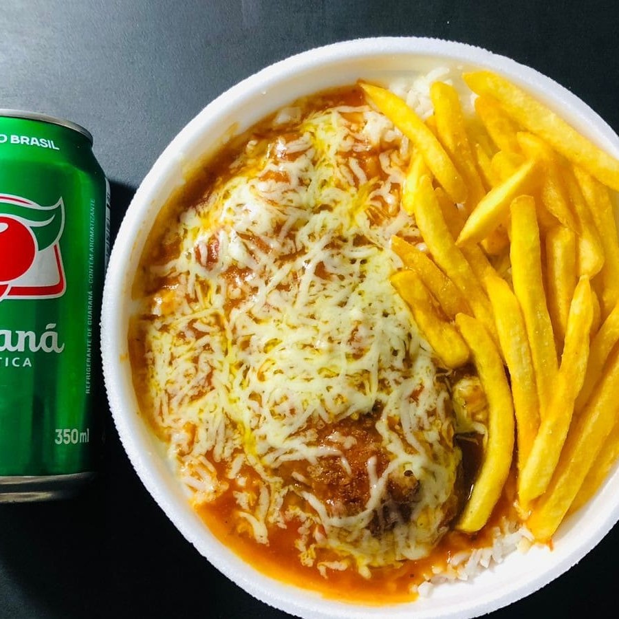 Marmita com delicioso filé de frango parmegiana (empanado na massa crocante coberto com molho de tomates e queijo) acompanhado de arroz branco e batatas fritas. Acompanha refrigerante lata Guaraná Antárctica lata 350ml bem gelada. Marmita indicada para 01 pessoa.