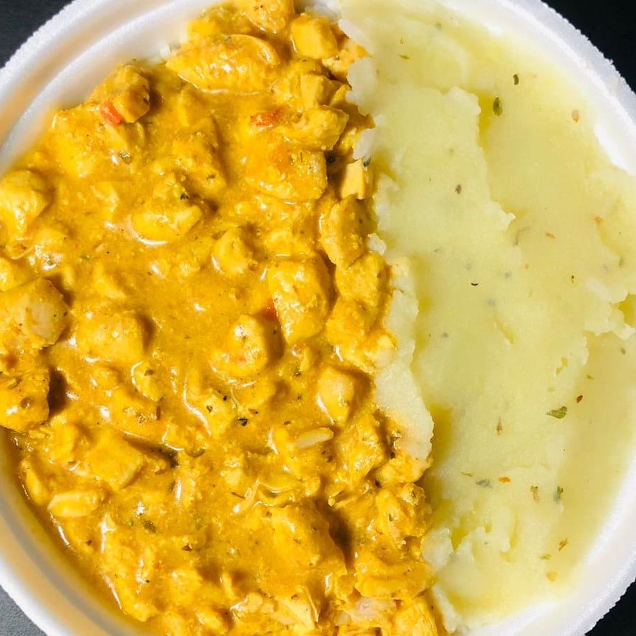 Marmita com delicioso filé de frango ao molho estrogonofe acompanhado de arroz branco e purê de batatas inglesas. Marmita indicada para 01 pessoa.