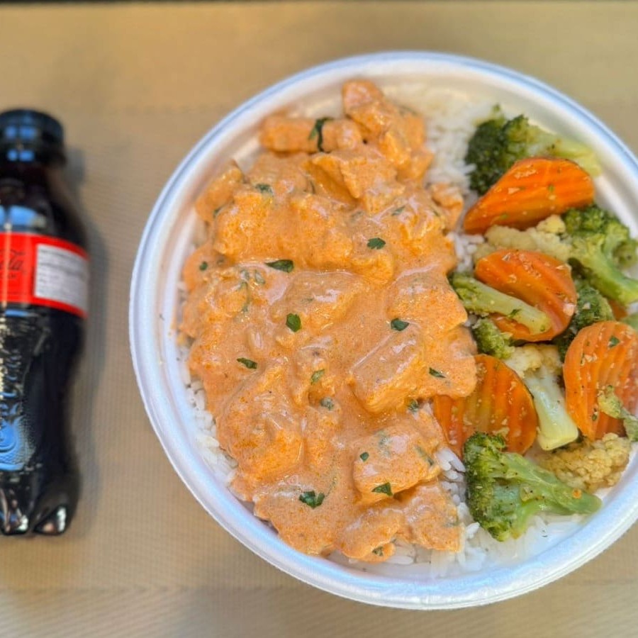 Marmita com delicioso filé de frango ao molho estrogonofe acompanhado de arroz branco e mix de legumes. Acompanha refrigerante pet Coca Cola bem gelado. Marmita indicada para 01 pessoa.