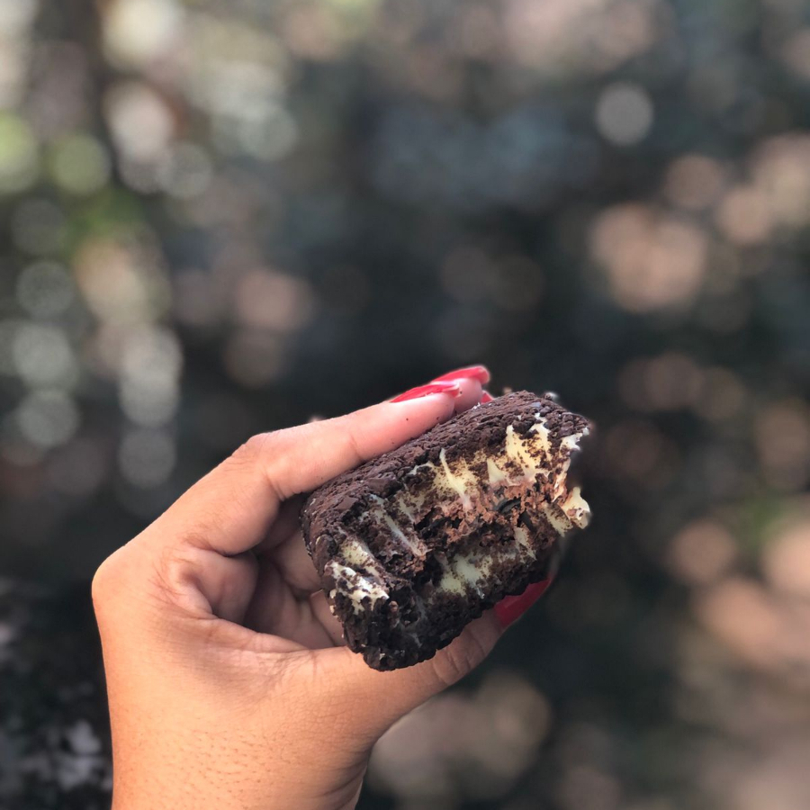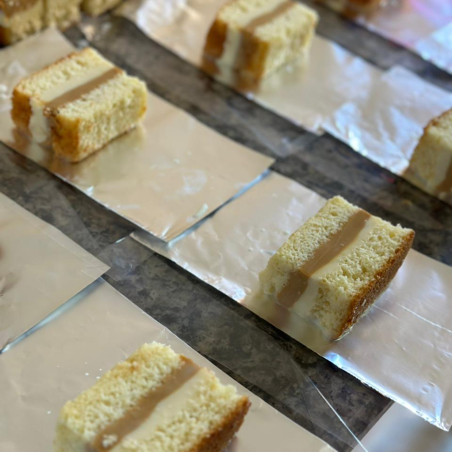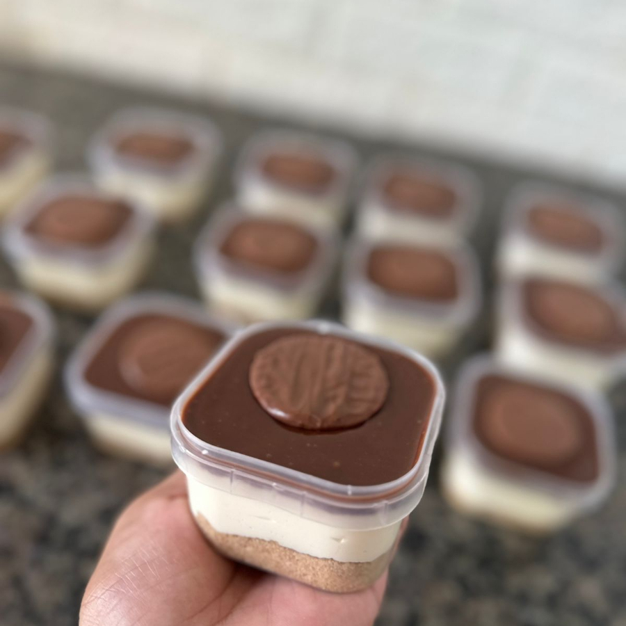 base de biscoito , um delicoso creme branco finalizado com uma ganache aõ leite , e bolacha calipso.