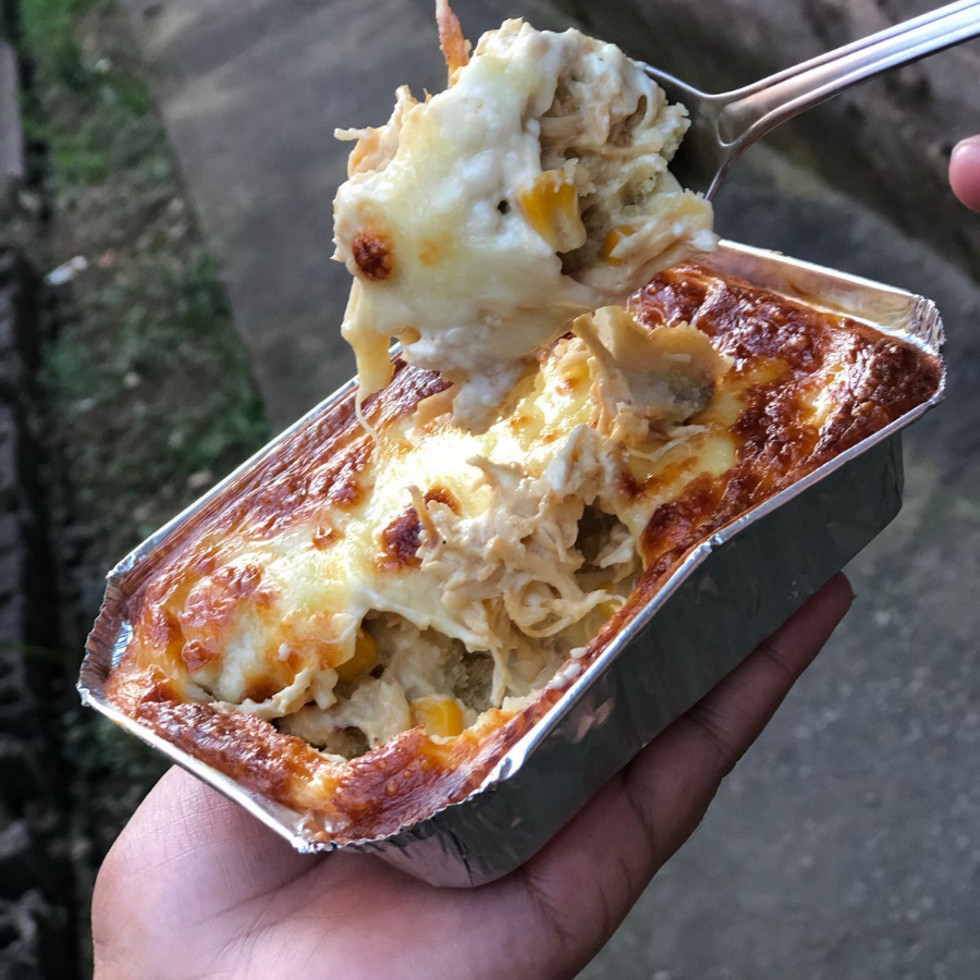 Massa de empada ,Recheio de Frango cremoso, finalizado com queijo mussarela .