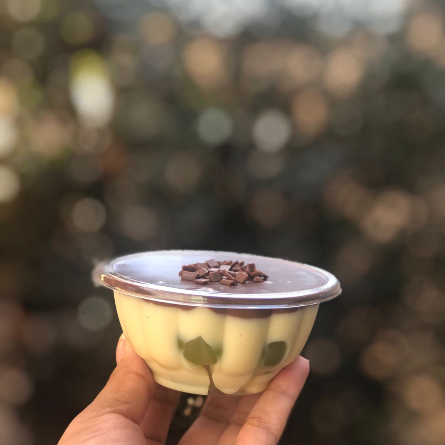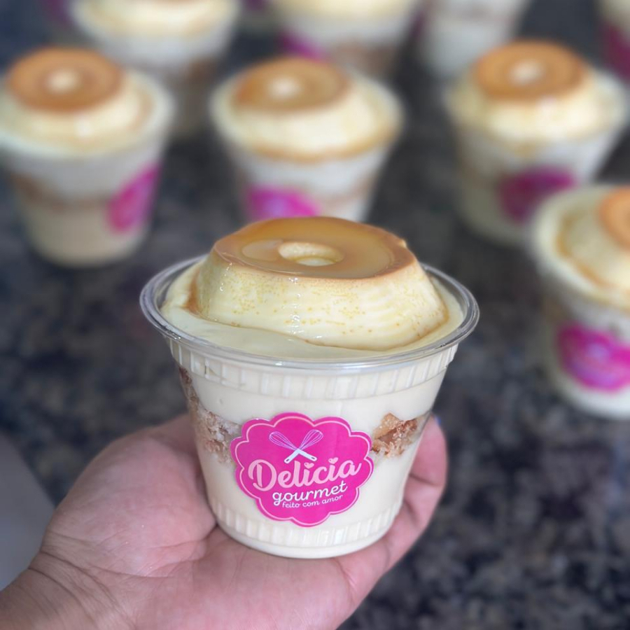 Creme 4 leites cremoso , biscoito folhado , Finalizado com Pudim .