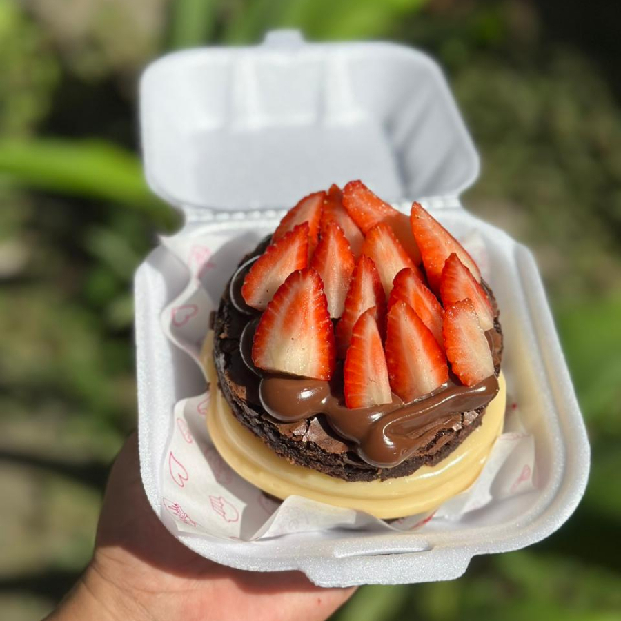Dois discos de brownie com recheio de ninho , cobertura de brigadeiro cremoso e morangos