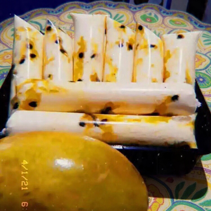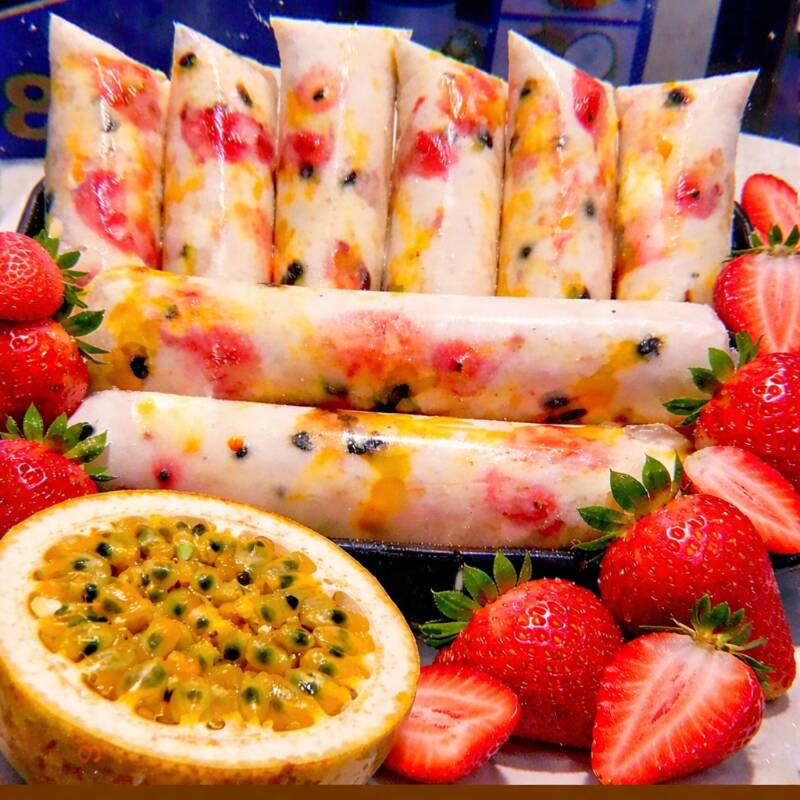 Deliciosa base creme de maracujá com muito pedaços de morango fresco