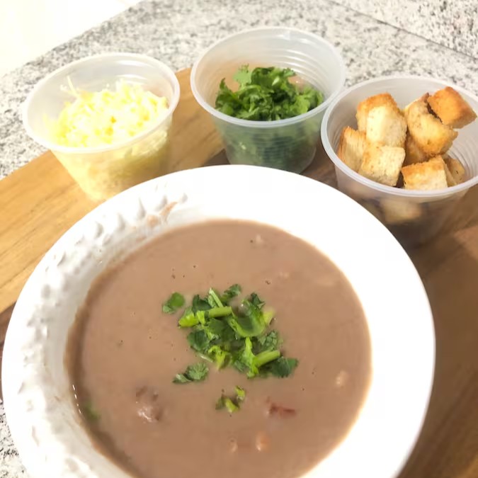 Delicioso caldo feito com feijão carioca, bacon, linguiça calabresa, coentro e um tempero especial da casa