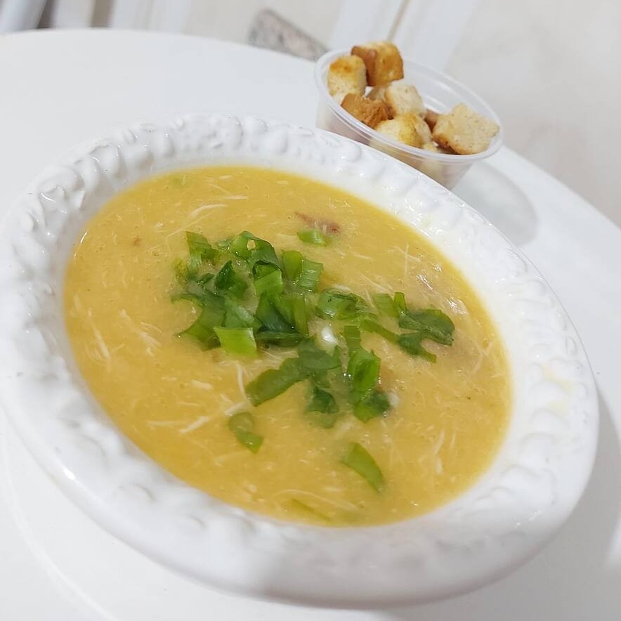 Delicioso caldo feito com batata, couve, bacon, calabresa, tempero caseiro e coentro