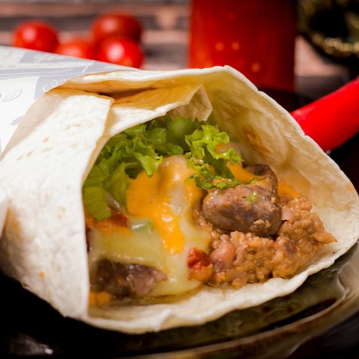 Tortilla enrolada feita à base de trigo, recheada com carne desfiada, cheddar, pico de gallo (vinagrete), cebola caramelizada e alface.