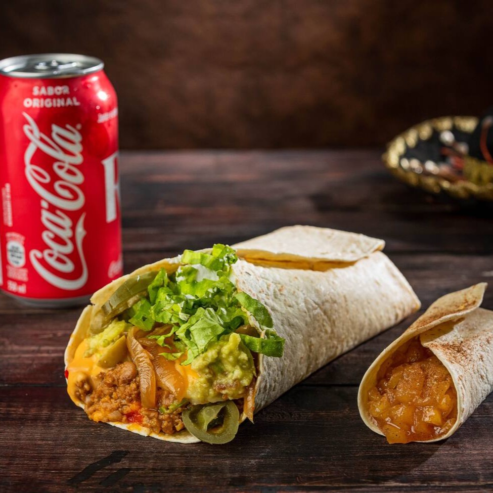 Combo para uma pessoa composto por: 1 burrito El Gran Chefe (o burrito completão da casa) 1 mini burrito manzanito (deliciosa sobremesa de calda de maçã e canela em pó) 1 refrigerante ou suco (lata)