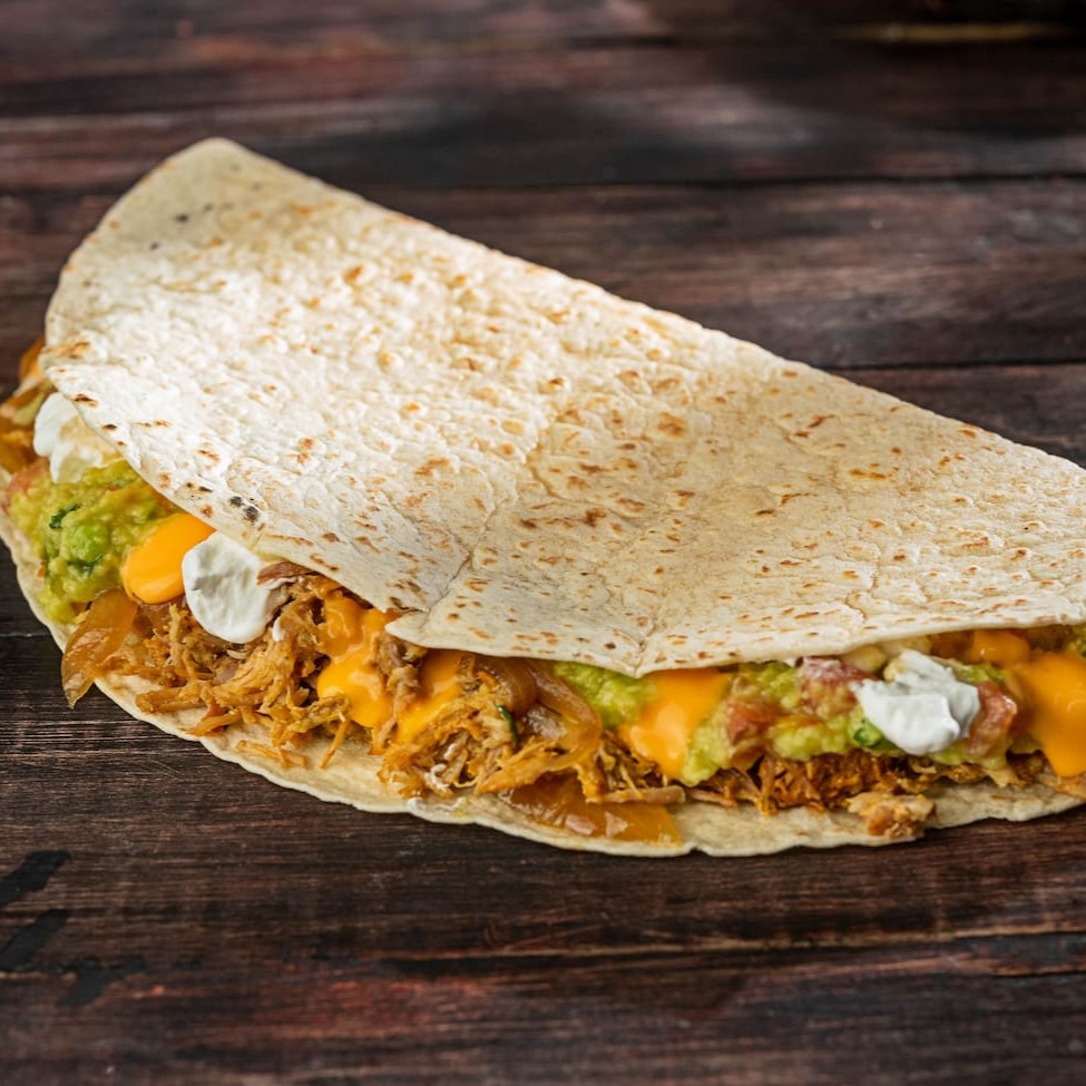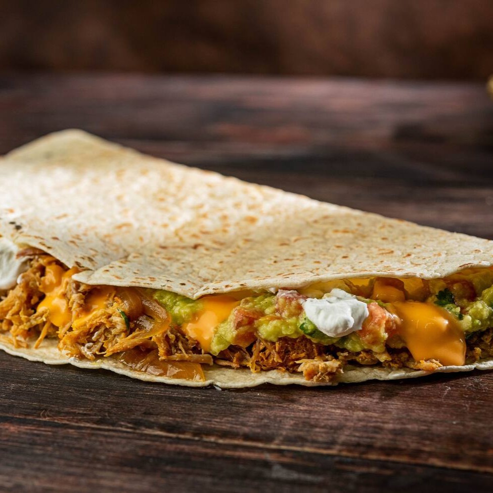Tortilla feita à base de trigo recheada com lascas de pernil, cheddar, guacamole, sour cream, cebola caramelizada. * Pimenta jalapeño opcional.