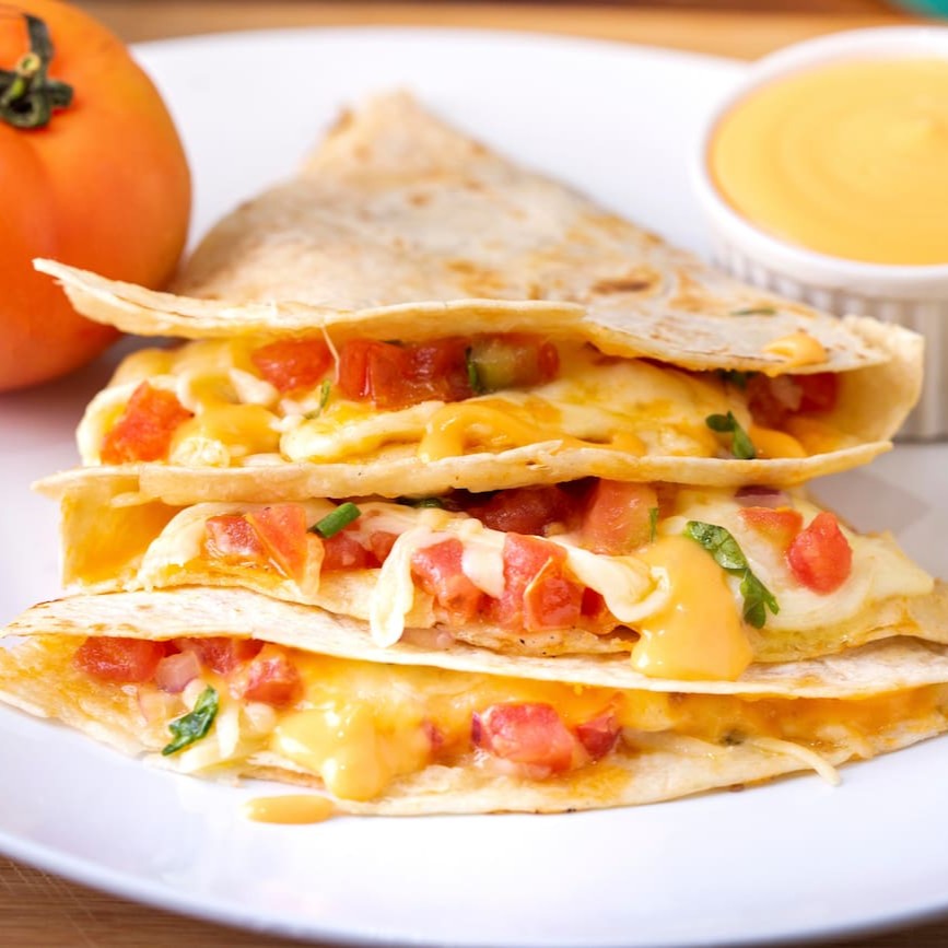 Tortilla feita à base de trigo, recheada com muçarela, cheddar e pico de gallo (como um vinagrete).