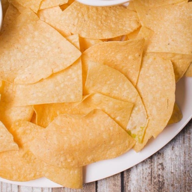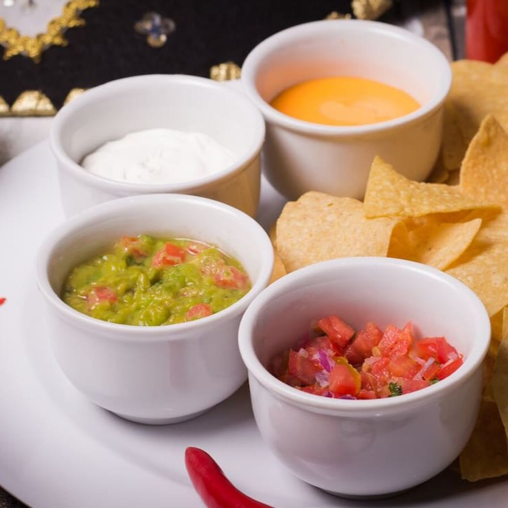 Porção de chips de milho, acompanhada com quatro molhos à sua escolha: guacamole, pico de gallo (vinagrete), sour cream e cheddar. .