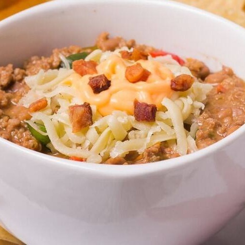 300 gramas de chilli com carne coberto com queijo muçarela e cheddar. Opção menor com 150 gramas de chilli. Obs.: Não acompanha nachos.