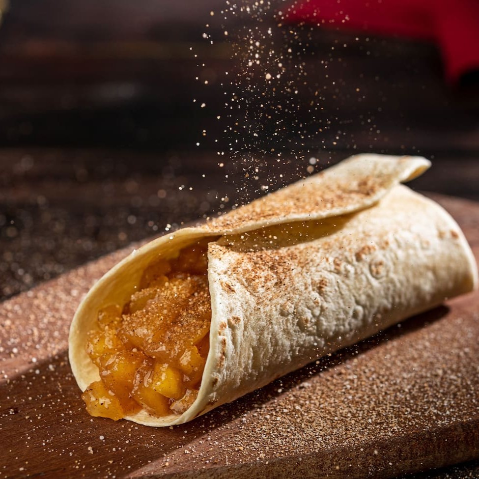 Mini burrito doce recheado com maçã em calda, polvilhado com açúcar e canela.