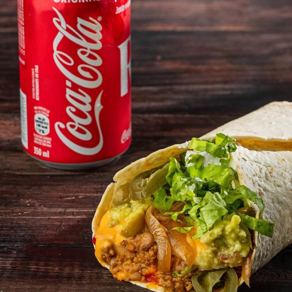 Combo completo com um burrito de tamanho normal (são algumas opções que vão variando a cada dia), mais um mini burrito manzanito, mais um refrigerante lata.