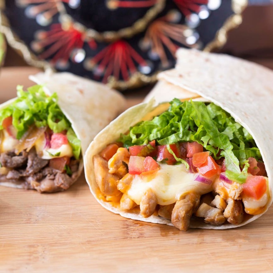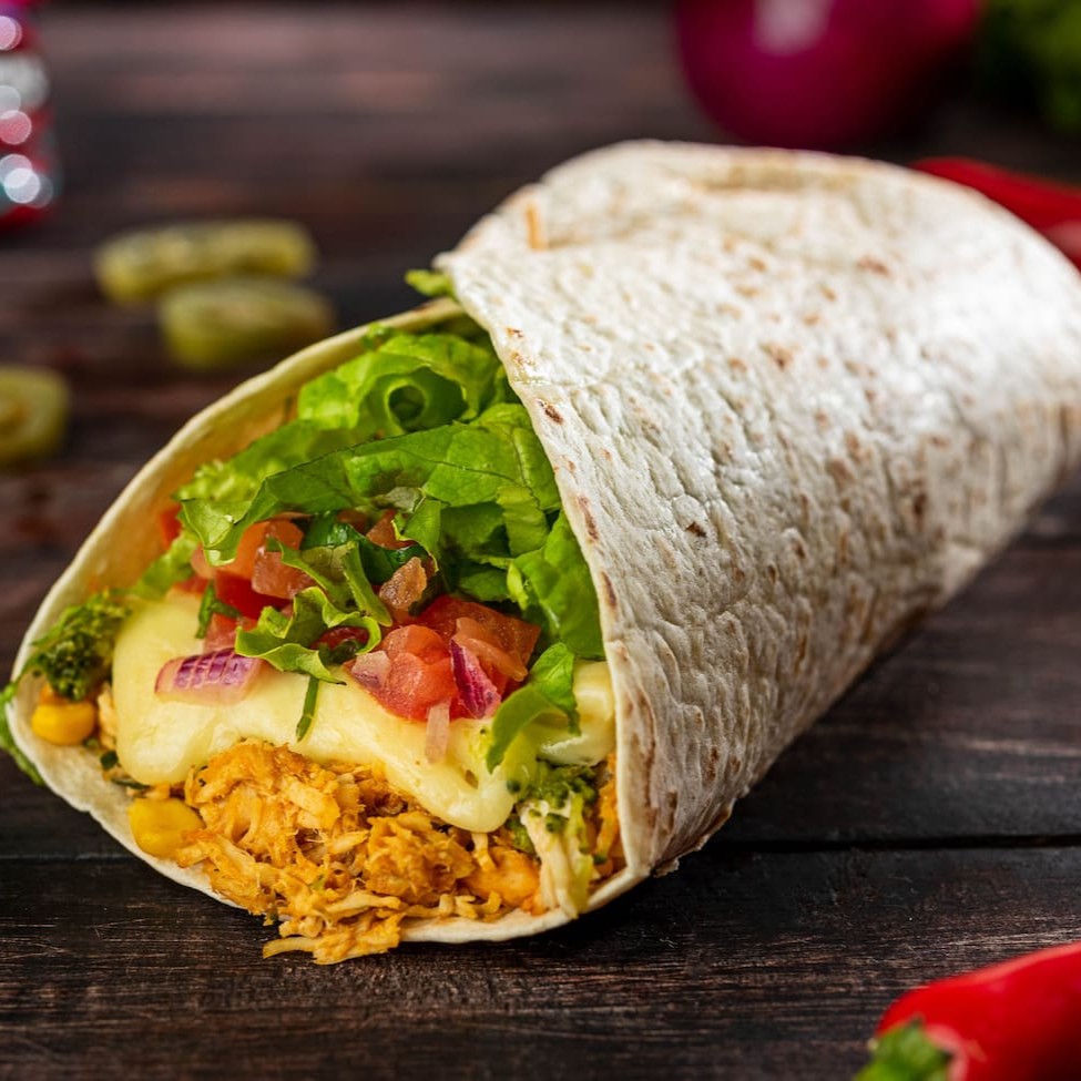 Tortilla enrolada feita à base de trigo, recheada com iscas de frango grelhado, pico de gallo (vinagrete), mix de queijos e alface. * Pimenta jalapeño opcional