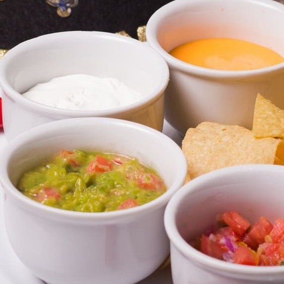 Opções de molho: guacamole, sour cream, pico de gallo ou cheddar. São duas opções de tamanho, a pequena é um potinho de 145 ml e a porção grande é um de 500ml.