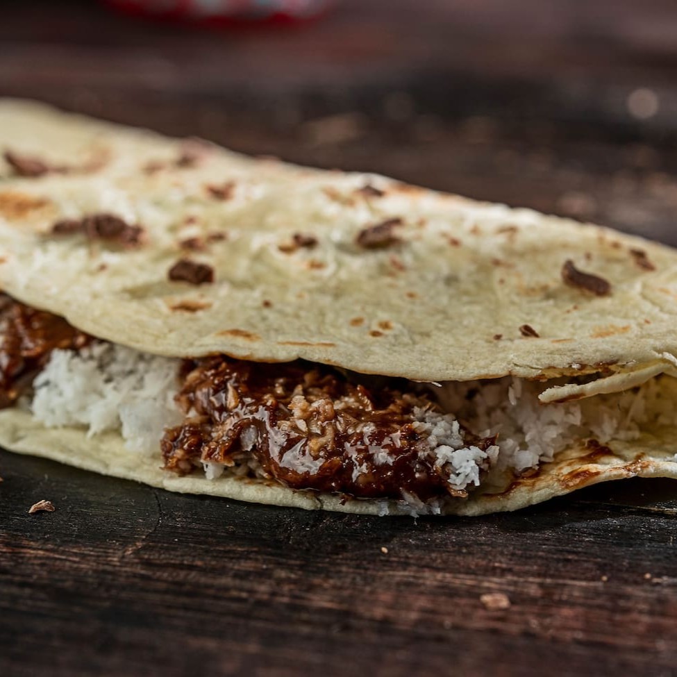 Tortilla feita à base de trigo, recheada com chocolate derretido e coco ralado. Serve duas pessoas.