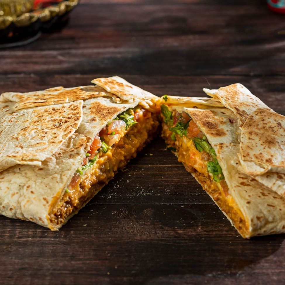 Tortilla feita à base de trigo, recheada com chilli com carne ou vegetariano (apimentado), muçarela, cheddar e pico de gallo (vinagrete). * Pimenta jalapeño opcional. * Caso queira sem pimenta alguma, deve ser pedido na observação.