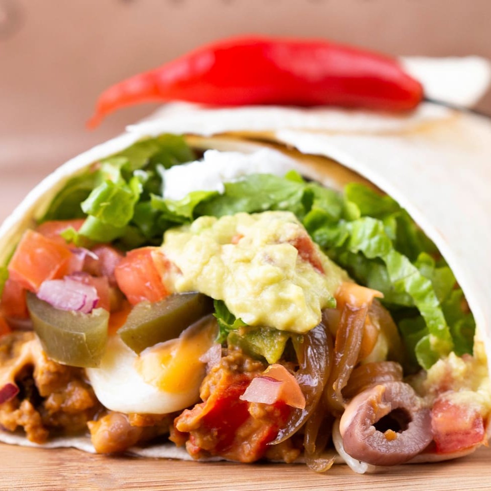 Tortilla enrolada feita à base de trigo, recheada com chilli com carne ou feito a base de proteína de soja (levemente apimentado), azeitonas, muçarela, guacamole e alface. * Pimenta jalapeño opcional. * Caso queira sem pimenta alguma, deve ser pedido na observação.