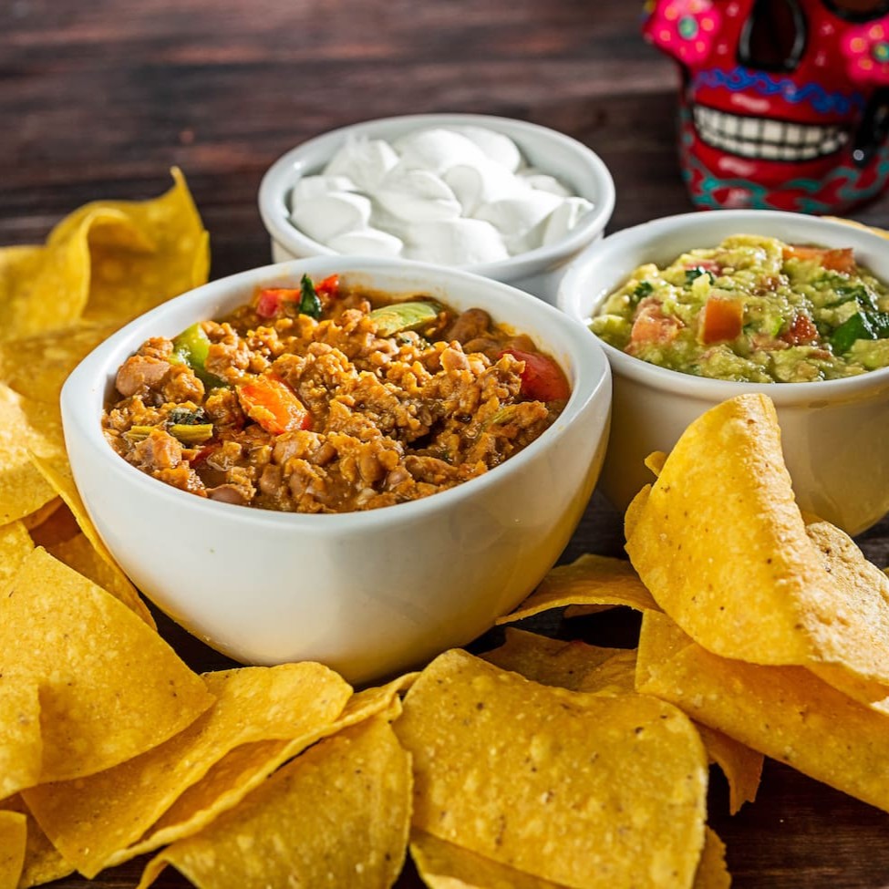 Porção de chips de milho combinada com chilli com carne ou vegetariano, coberto com queijo muçarela e cheddar. * Agora você pode adicionar porções de guacamole, sour cream, pico de gallo cheddar, se e quantos quiser, somando o valor do molho escolhido.