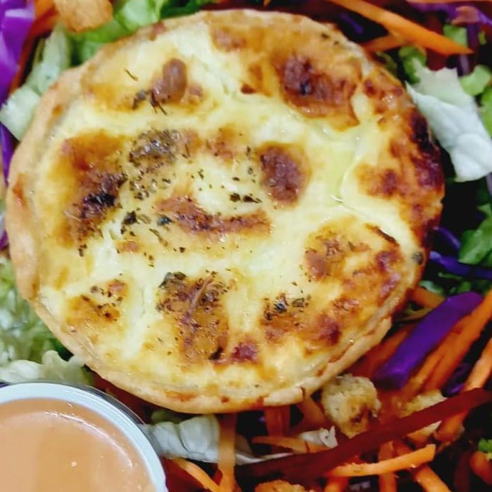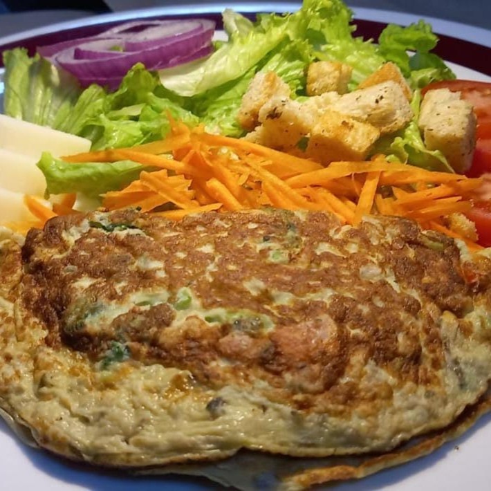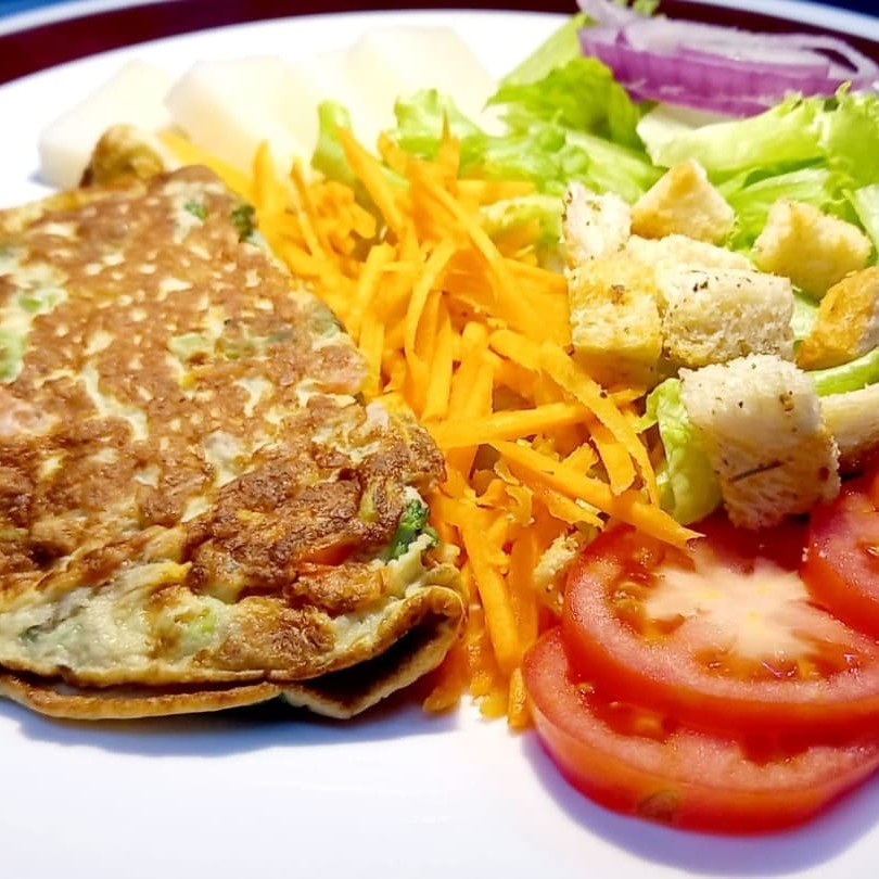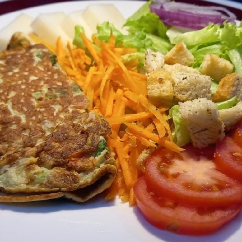 Delicioso Omelete de vegetais, preparado com ovos batidos, brócolis frescos, muçarela, cenoura, tomate, cebola picadinha, um toque de leite e goma de tapioca. Acompanhada uma refrescante salada composta por um mix de folhas, tomate, cenoura e beterraba raladas, cebola roxa, tabule, gergelim e crocantes croutons. Um prato preparado com cuidado e carinho para proporcionar uma experiência culinária i