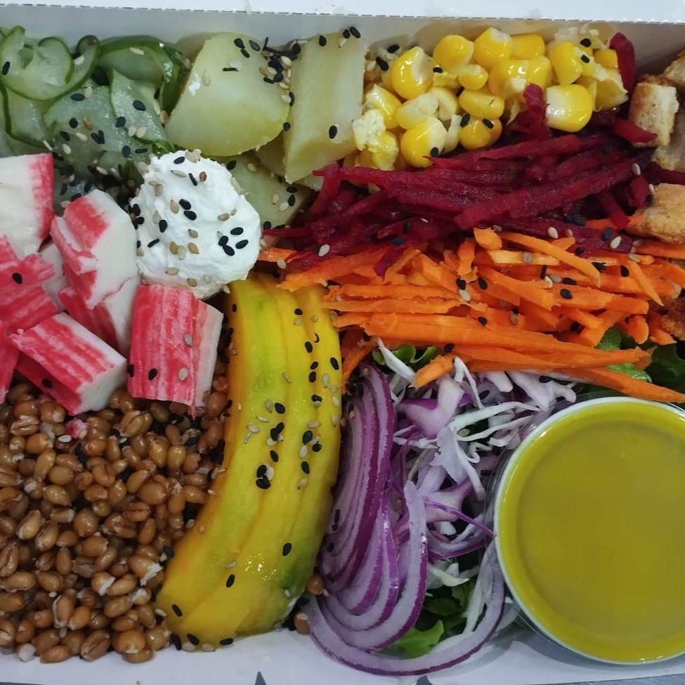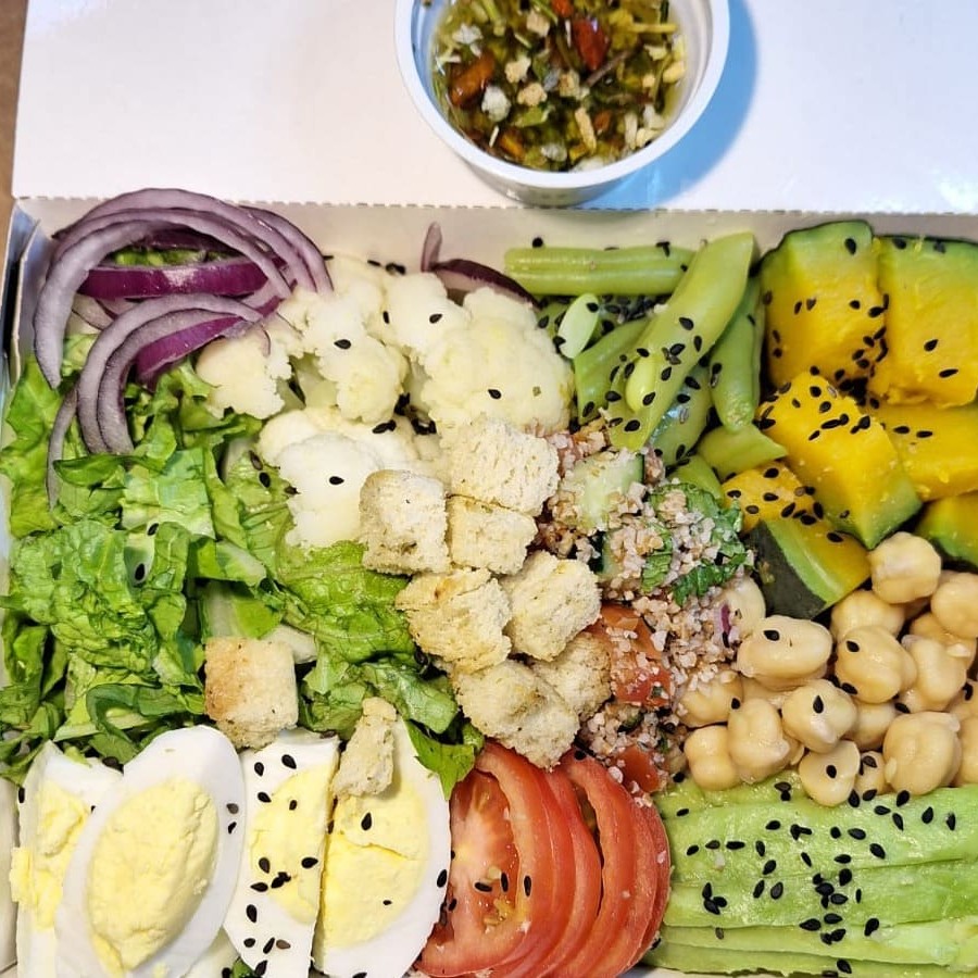 Uma explosão de sabores e cores, este prato é uma combinação perfeita de um mix de folhas frescas, grão de bico, beterraba, brócolis, abóbora, abobrinha e tabule. A adição de abacate, frescal e ovo trazem um contraste delicioso de sabores. Finalizado com castanha e gergelim torrado e, por fim, um molho à sua escolha para personalizar ao seu gosto. Uma salada verdadeiramente nutritiva e deliciosa!