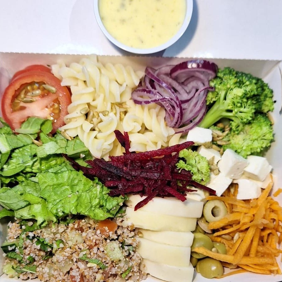 Uma explosão de sabores e cores, este prato é uma combinação perfeita de um mix de folhas frescas, macarrão sem glúten suavemente cozido, tomates, beterraba e cenoura raladas, azeitonas fatiadas, brócolis crocantes e tabule. A adição de manga suculenta e cebola roxa traz um contraste delicioso de sabores. Finalizado com frescal, gergelim torrado e, por fim, um molho à sua escolha para personalizar