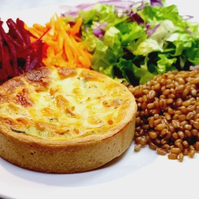Deliciosa Quiche Lorraine, uma verdadeira estrela de nossa casa! Com um recheio irresistível de bacon crocante, combinado com muçarela e creme de queijo. Servida com uma refrescante e colorida salada de mix de folhas, trigo em grãos, cenoura e beterraba raladas, com um toque crocante das sementes de girassol e crutons. A cebola roxa acrescenta um sabor único e ao final, escolha o molho de sua pref