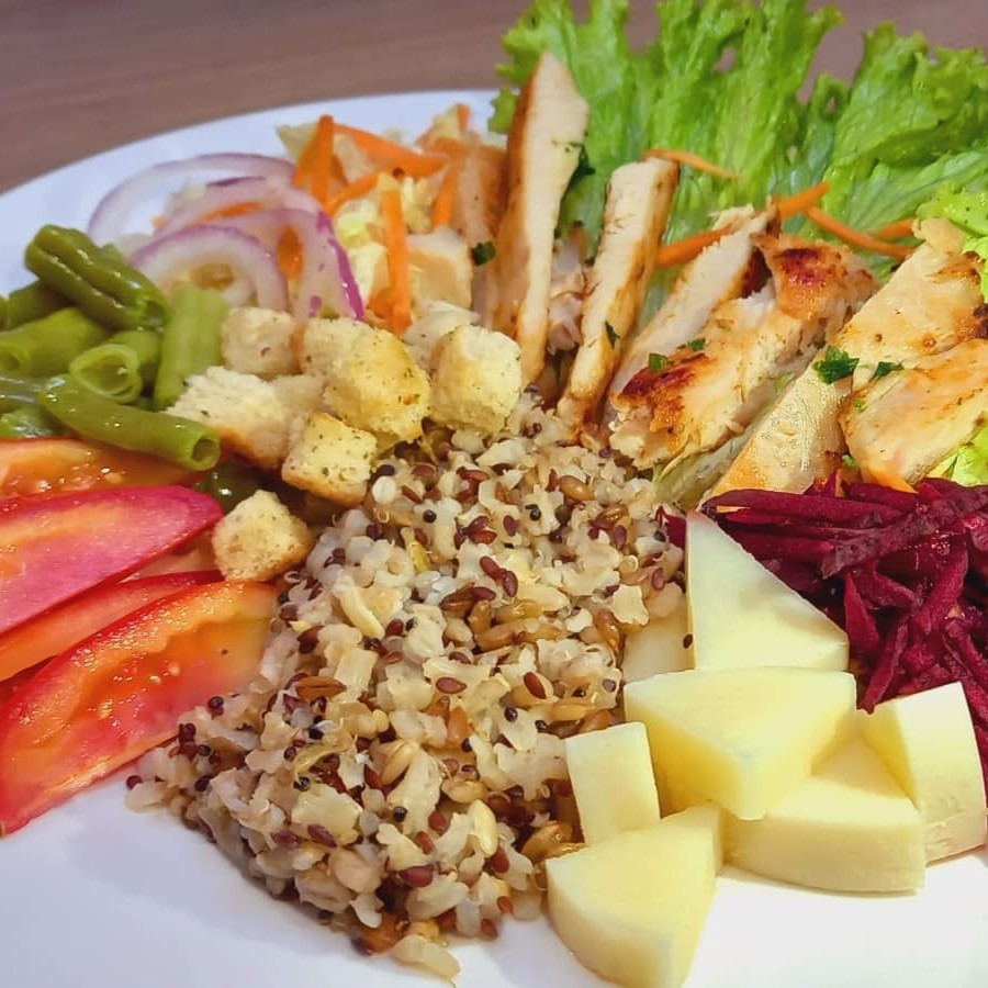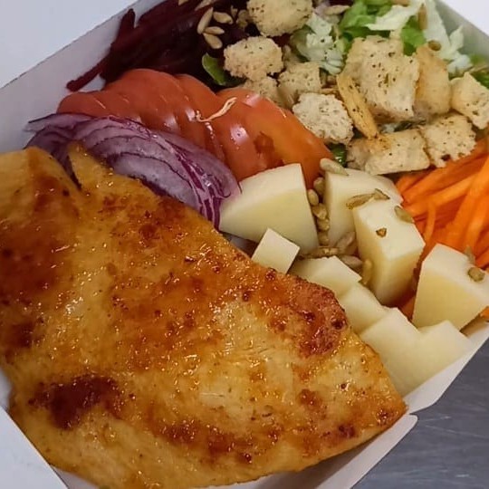 Um dos pratos mais requisitados em nosso cardápio. Um delicioso frango grelhado acompanhado por uma salada composta por um mix de folhas frescas, fatias de tomate, cenoura e beterraba delicadamente raladas, cebola roxa, tabule, sementes de gergelim e os croutons crocantes completam a experiência gastronômica.