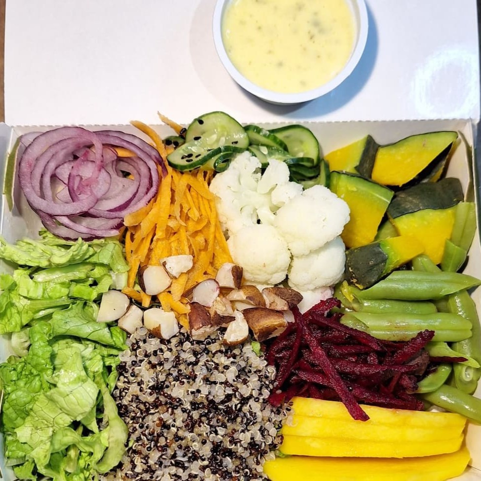 Combinação nutritiva e cheia de sabor, com um mix de folhas frescas, mix de quinoa, brócolis, abóbora, beterraba e cenoura raladas, abobrinha levemente regada no azeite, sonomono, castanhas crocantes e o doce da manga contrastando com o toque picante da cebola roxa, para finalizar, sementes de girassol e um molho à sua escolha para complementar esta delícia. Um prato repleto de nutrientes, com mui