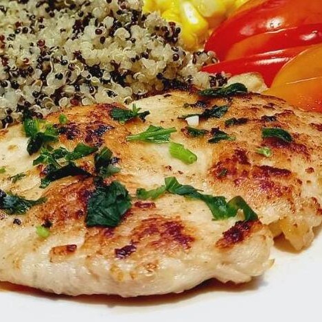 Filé de frango grelhado acompanhado de arroz sete grãos, legumes salteados (batata doce, abobrinha, milho e grão de bico), mix de folhas, cenoura e tabule e para finaliza, semente de girassol.