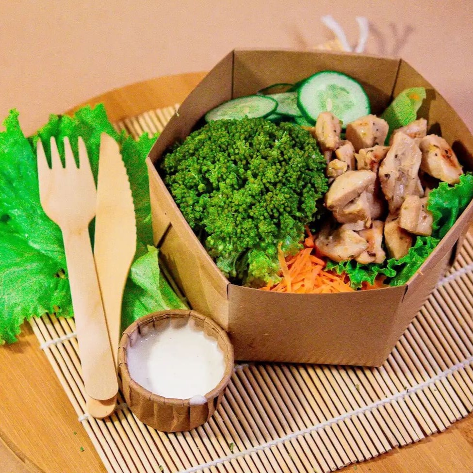 Alface fresquinhos, frango grelhado , croûtons artesanais e parmesão ralado na hora com molho Caesar 50ml; Além dessa combinação toda nosso restaurante envia em embalagens sustentáveis.
