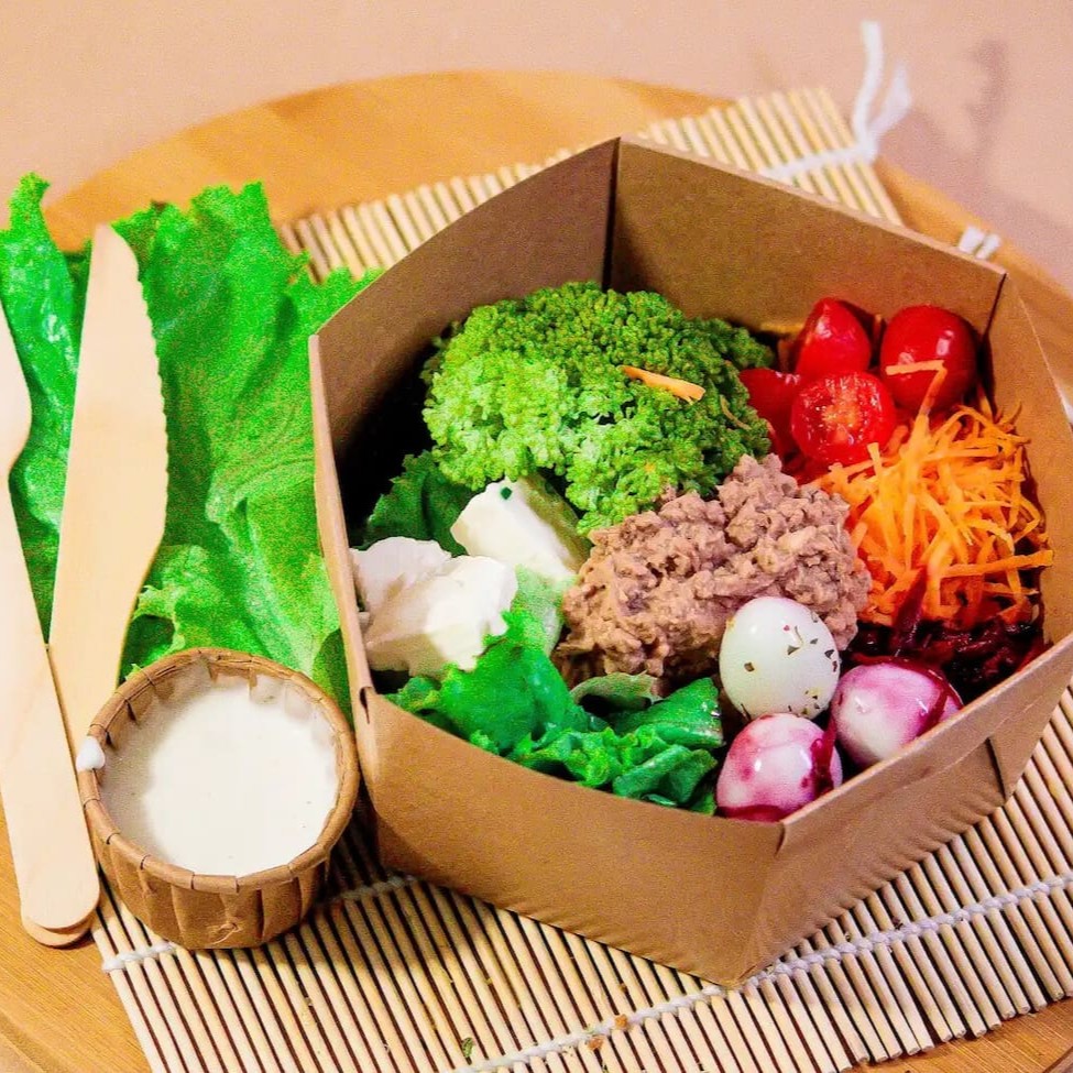 Atum ralado, cenoura, beterraba, queijo branco, tomate Sweet Grape, brócolis, alface, ovos de cordorna + 50ml de molho