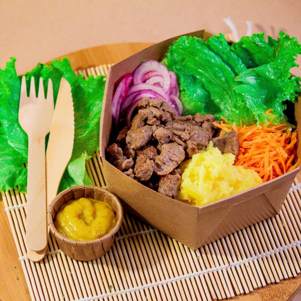 Aprox. 140g de filé mignon, purê de mandioquinha, aprox. 150g de arroz japonês, cebola roxa, cenoura, alface + 50ml de molho mostarda e mel