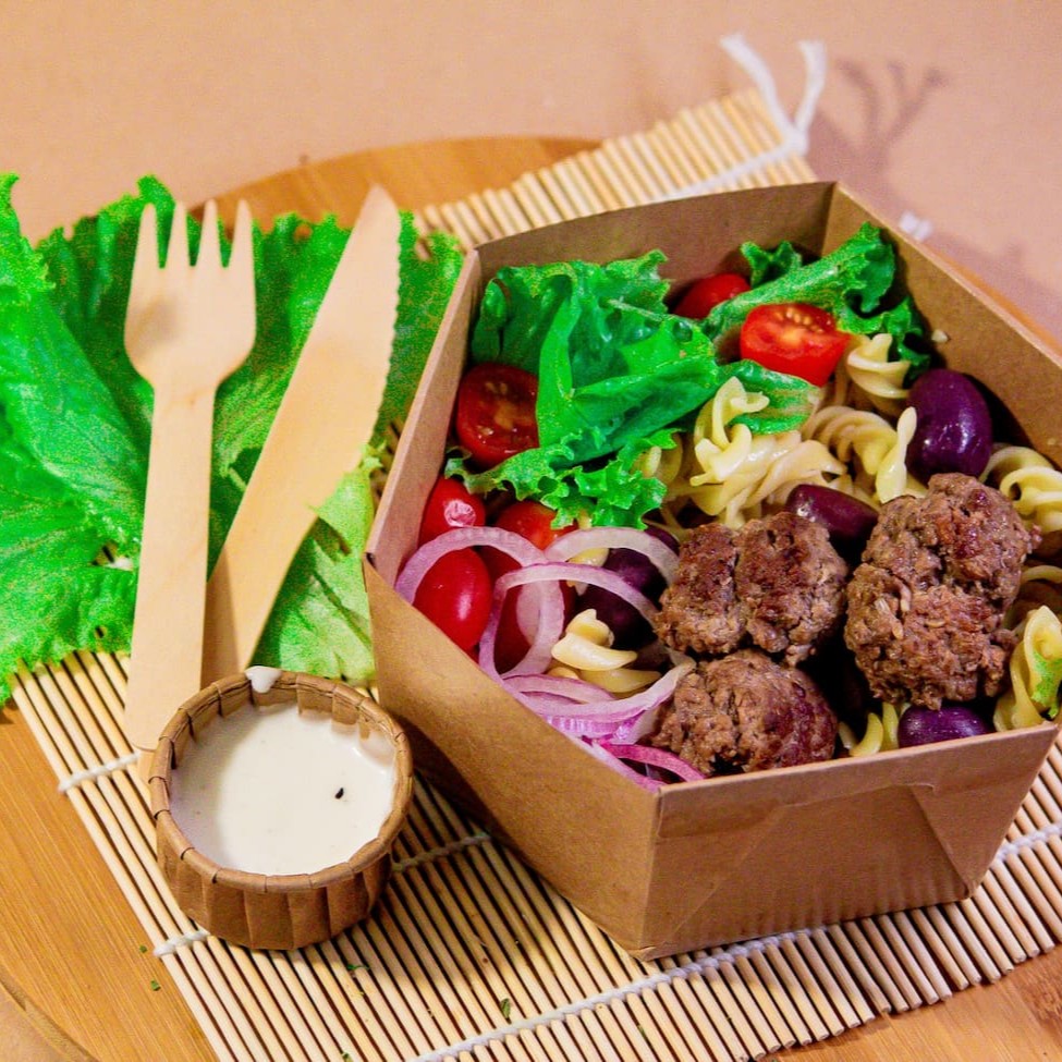 Almondegas, macarrão fusilli ao aglio e olio, cebola roxa, tomate Sweet Grape, azeitonas pretas e alface + 50ml de molho