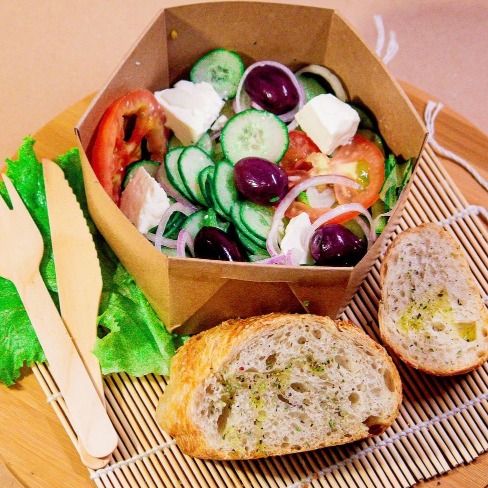 Tomate, pepino japonês, cebola roxa, pimentão verde, azeitonas pretas, queijo branco fresco, azeite de oliva extravirgem, sal, vinagre de vinho tinto, pão e orégano É um prato típico da Grécia e uma das saladas mais famosas do mundo