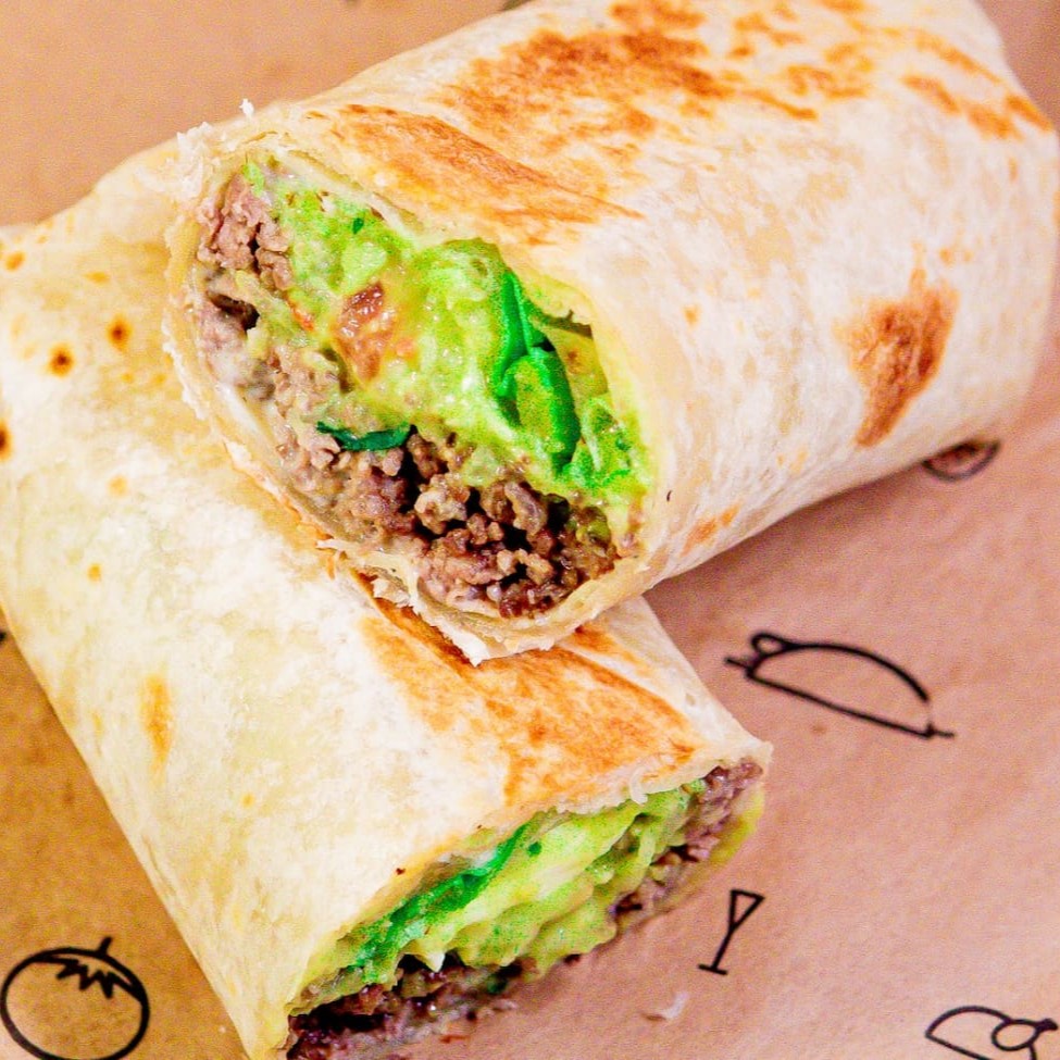 Tortilla de 25cm, carne moída, guacamole caseiro, queijo branco fresco e alface