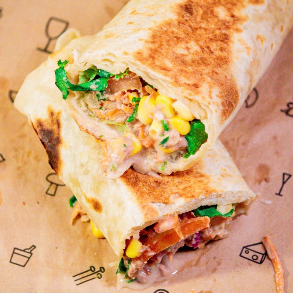 Tortilha tamanho grande, atum ralado, milho, requeijão light, tomate, salsinha, cenoura e alface Serve bem uma pessoa
