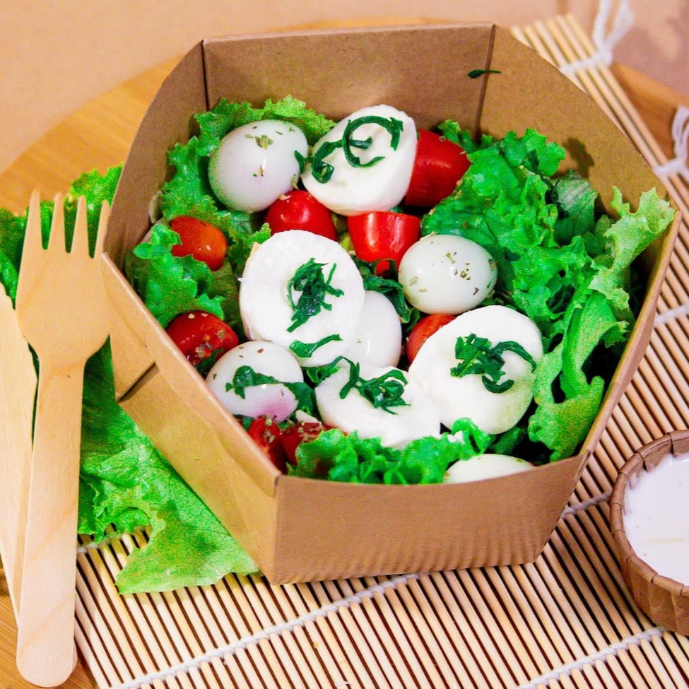 Alface, tomate Sweet Grape, ovos de codorna, orégano e mozzarela de búfala + 50ml de molho