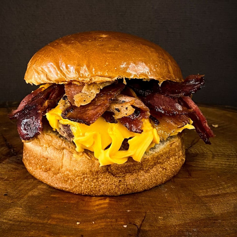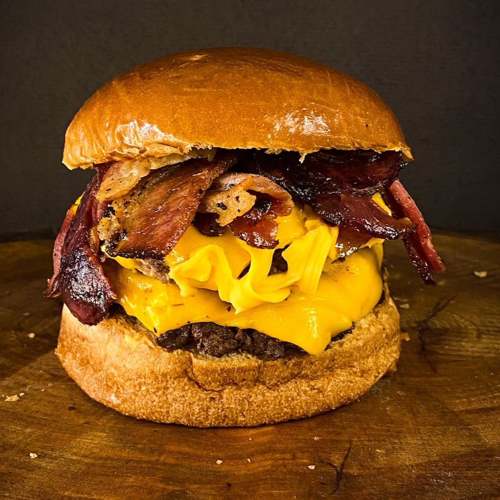 Apresentamos o nosso 'Bacon G', um hambúrguer da categoria 'Burgers com até 50% off em Janeiro'. Este prato tentador é cuidadosamente montado com um pão brioche fresco e macio, aconchegando três generosas porções de carne de 80g cada. Adicionamos fatias grandes de bacon crocante para agradar os amantes desta iguaria. Para completar, uma camada de queijo cheddar derretido se funde com o ketchup e a