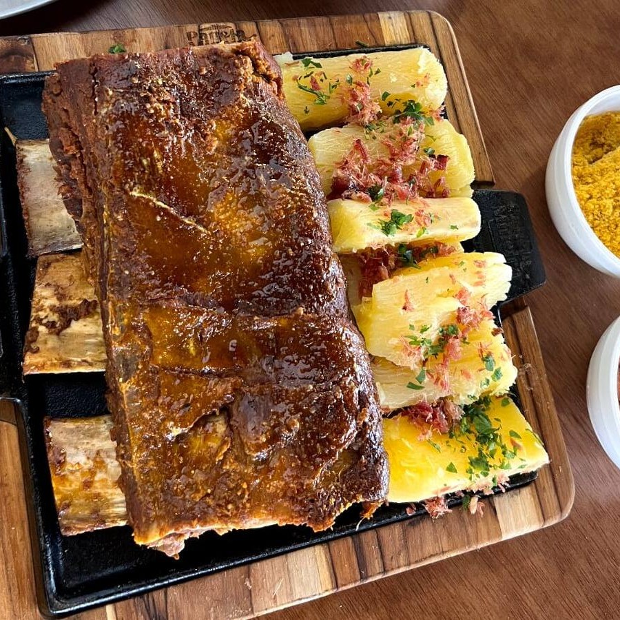 Acompanha: Arroz, mandioca cozida com bacon, vinagrete e farofa