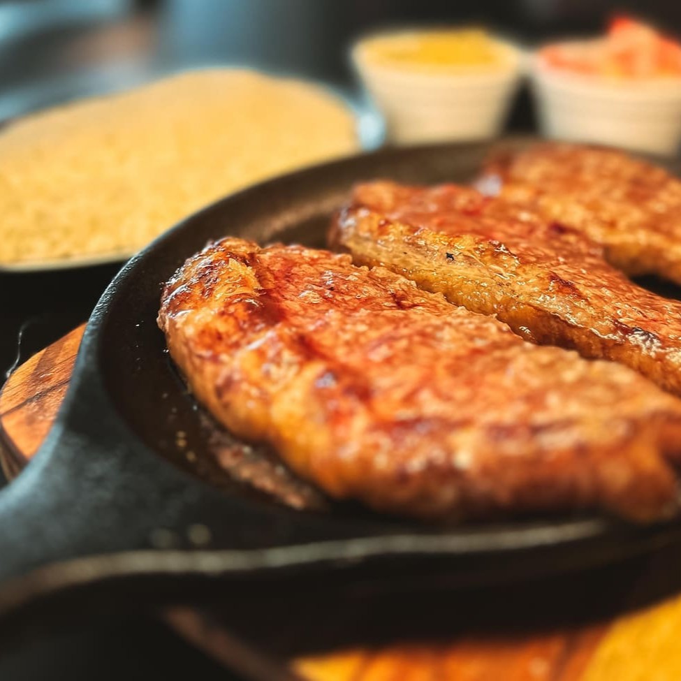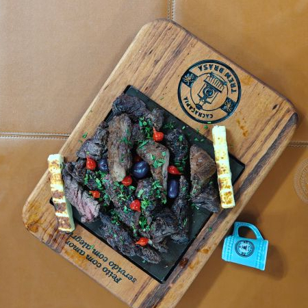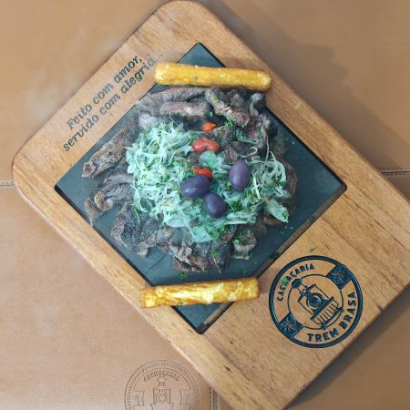Deliciosa porção de aproximadamente 800 gramas de fraldinha na brasa acompanha 2 espetos de queijo coalho, farofa, vinagrete e molho verde..