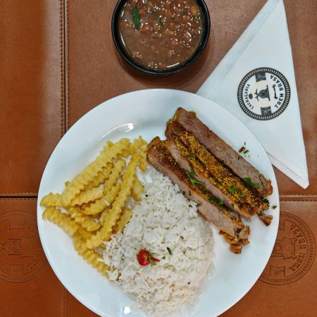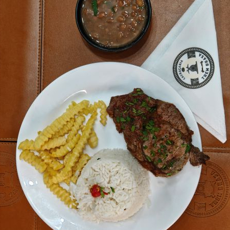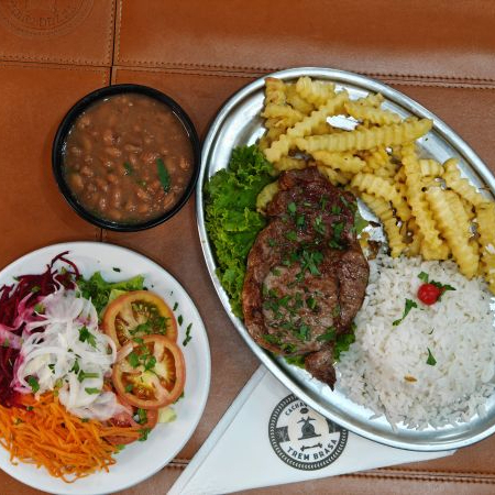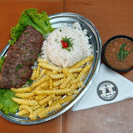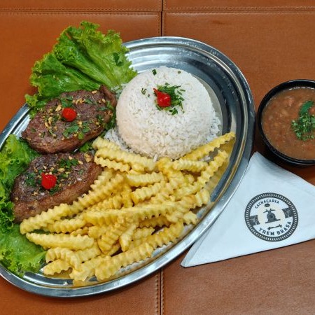 Suculento filé mignon na brasa acompanha arroz, feijão e fritas.