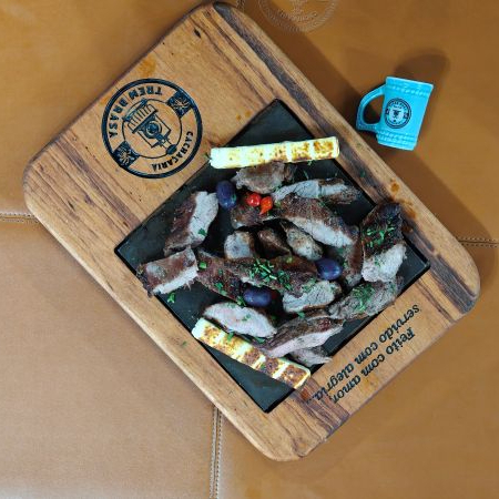Deliciosa porção de aproximadamente 800 gramas de maminha na brasa acompanha 2 espetos de queijo coalho, farofa, vinagrete e molho verde.
