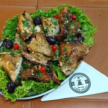 Deliciosa porção de aproximadamente 800 gramas de linguiça toscana na brasa acebolada acompanha 2 espetos de queijo coalho, farofa, vinagrete e molho verde.