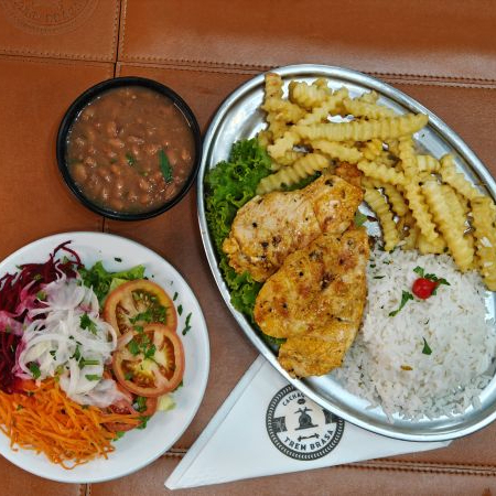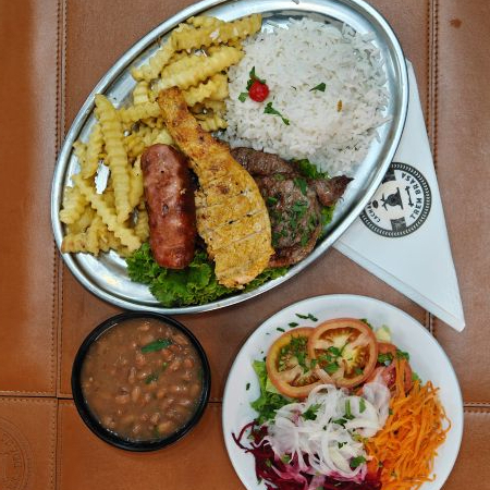Delicioso filé de frango, carne, linguiça aperitivo acompanha arroz, feijão, fritas, salada.