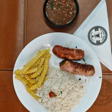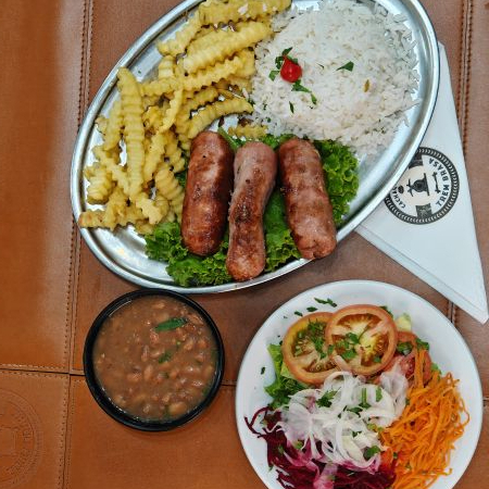 Deliciosa linguiça na brasa acompanha arroz, feijão, fritas e salada.
